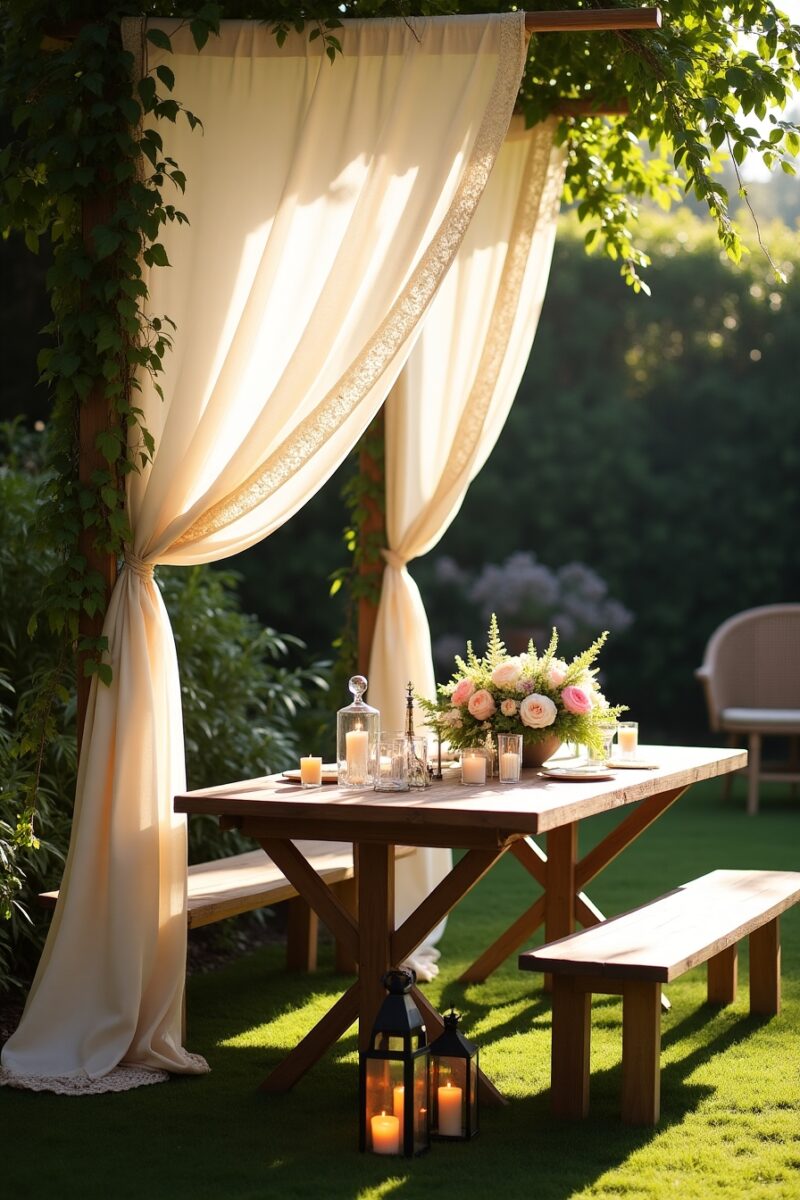 You can create stunning overhead structures using inexpensive sheets, curtains, or fabric remnants suspended from trees, pergolas, or temporary poles.