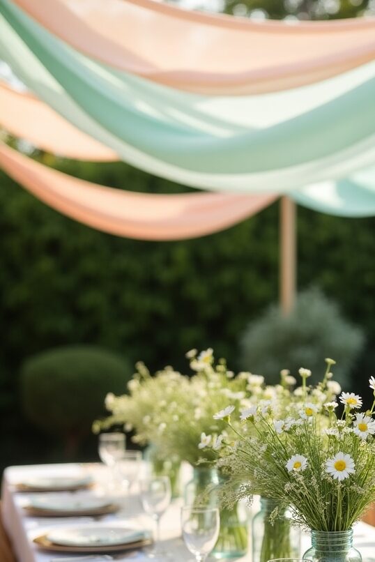 You’ll need some sturdy rope or wire as your support structure, along with sheets or lightweight fabric in colors that complement your garden or party theme.