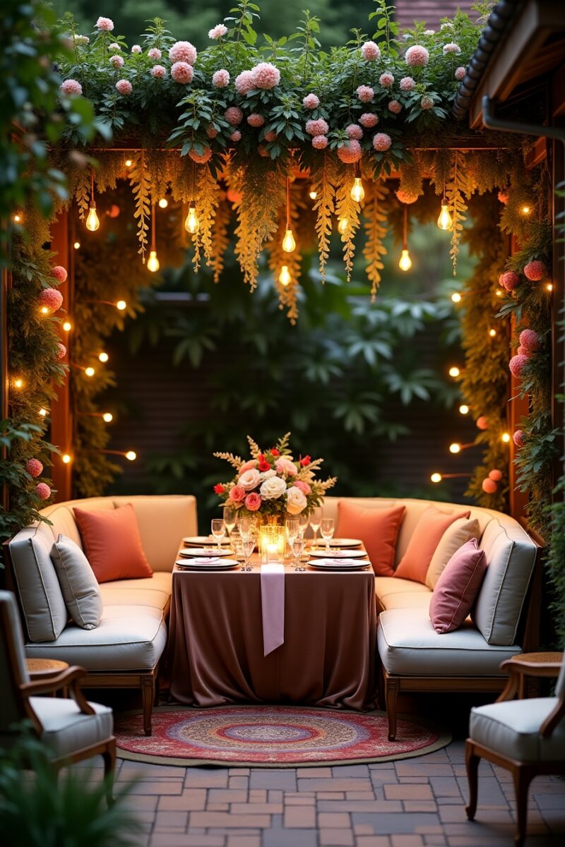 You’ll create the most inviting atmosphere by ensuring each conversation nook has its own lighting source, whether lanterns placed on the ground, string lights overhead, or solar stakes surrounding the area.