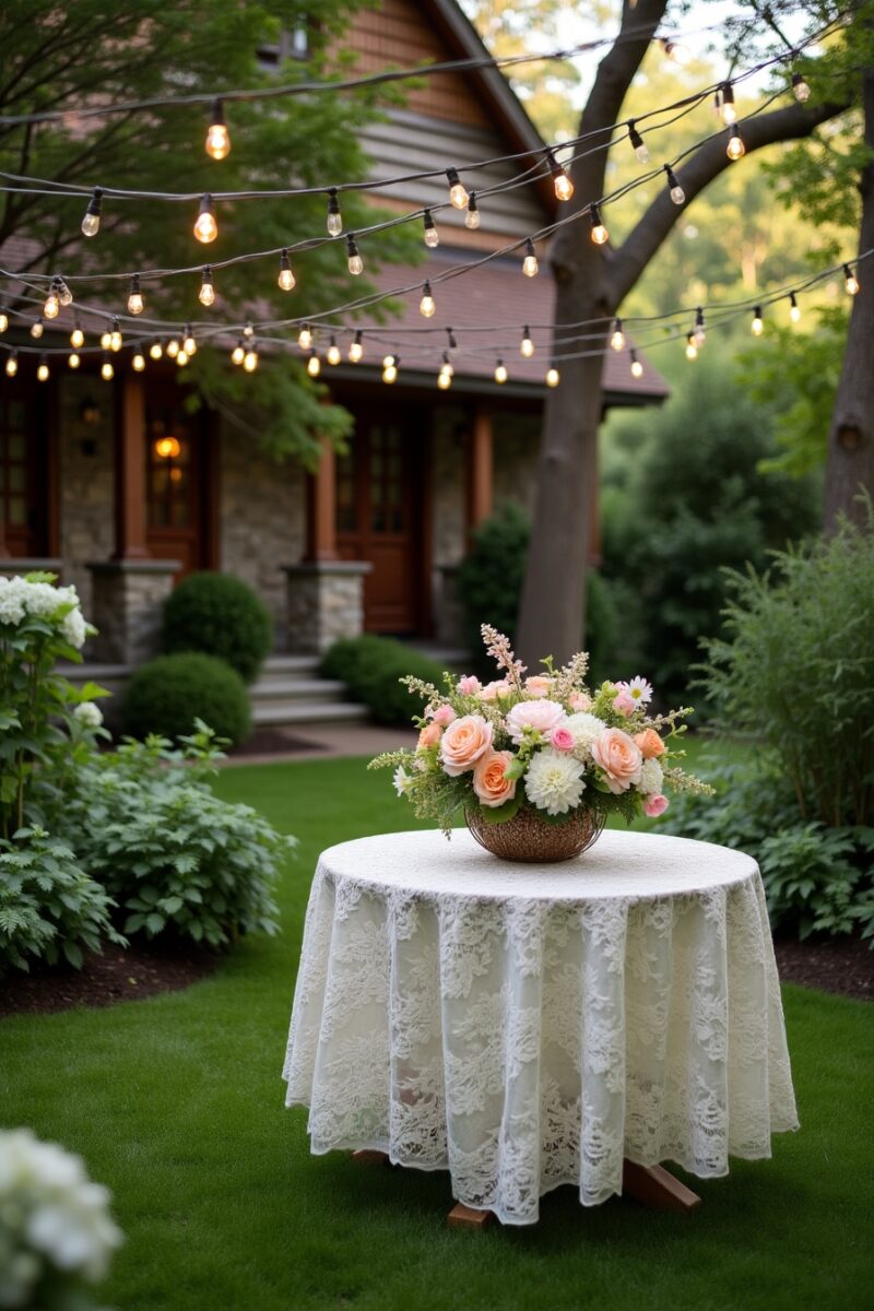 You might use weather-resistant fabric as a tablecloth, securing it with decorative weights or pretty rocks to prevent wind disruption.