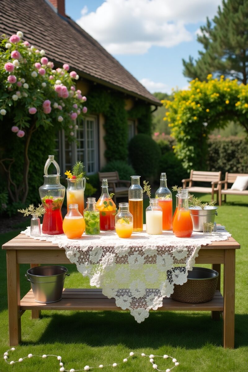 Consider theme-appropriate containers – hollowed watermelons for fruit punches, vintage watering cans for lemonade, or mason jars with spigots for iced tea.