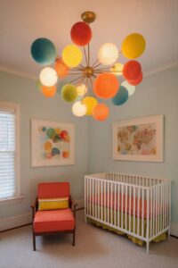 Lighting becomes part of the theme with a pendant light that casts rainbow shadows or string lights in soft rainbow colors that create gentle ambiance.
