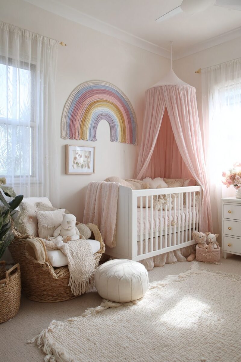 Choose furniture in natural wood tones that complement the soft colors beautifully, allowing the rainbow elements to be the stars of the show.