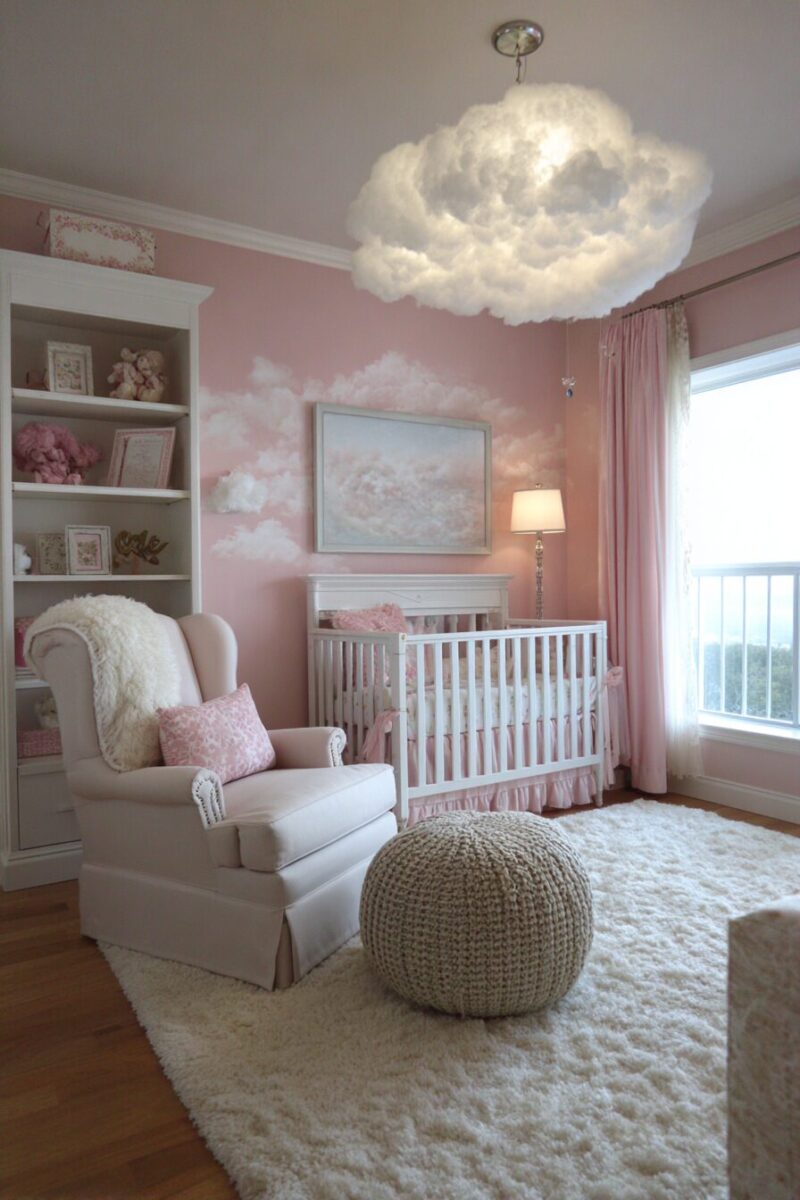 Add a plush white area rug that feels like walking on clouds, and scatter cloud-shaped pillows around a comfortable nursing chair.