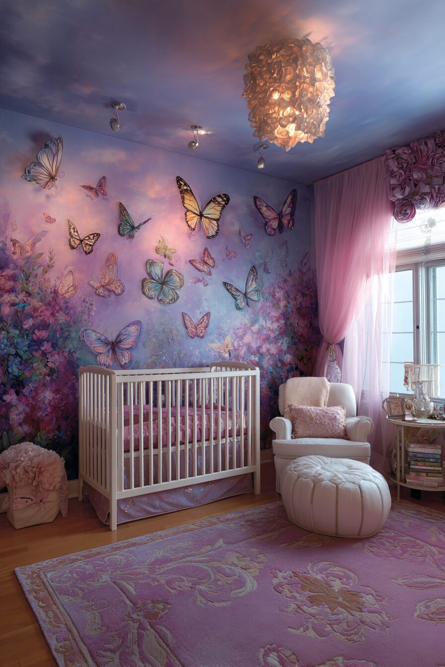 Create a nursery that feels like walking through a magical butterfly conservatory where colorful wings flutter and nature comes alive.