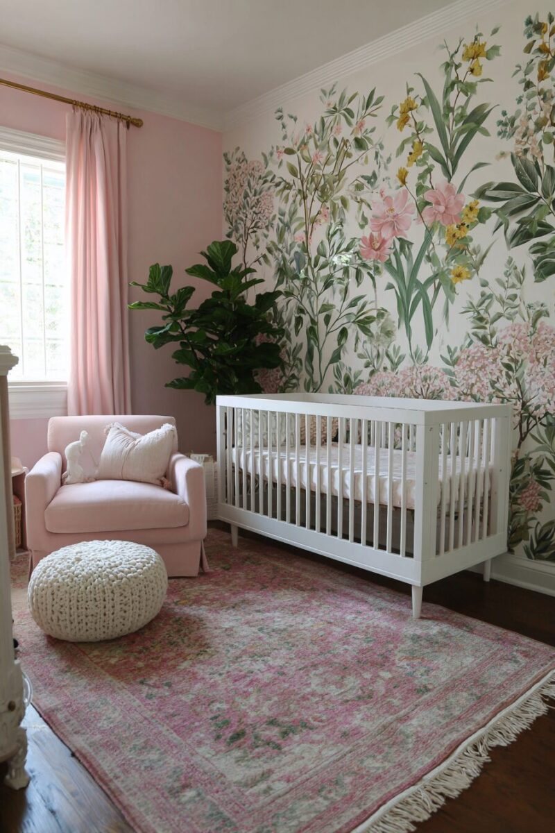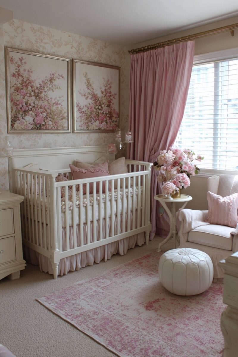 Start with a vintage-inspired crib painted in antique white or soft cream, paired with bedding that features tiny roses or vintage-style polka dots in blush pink and sage green.