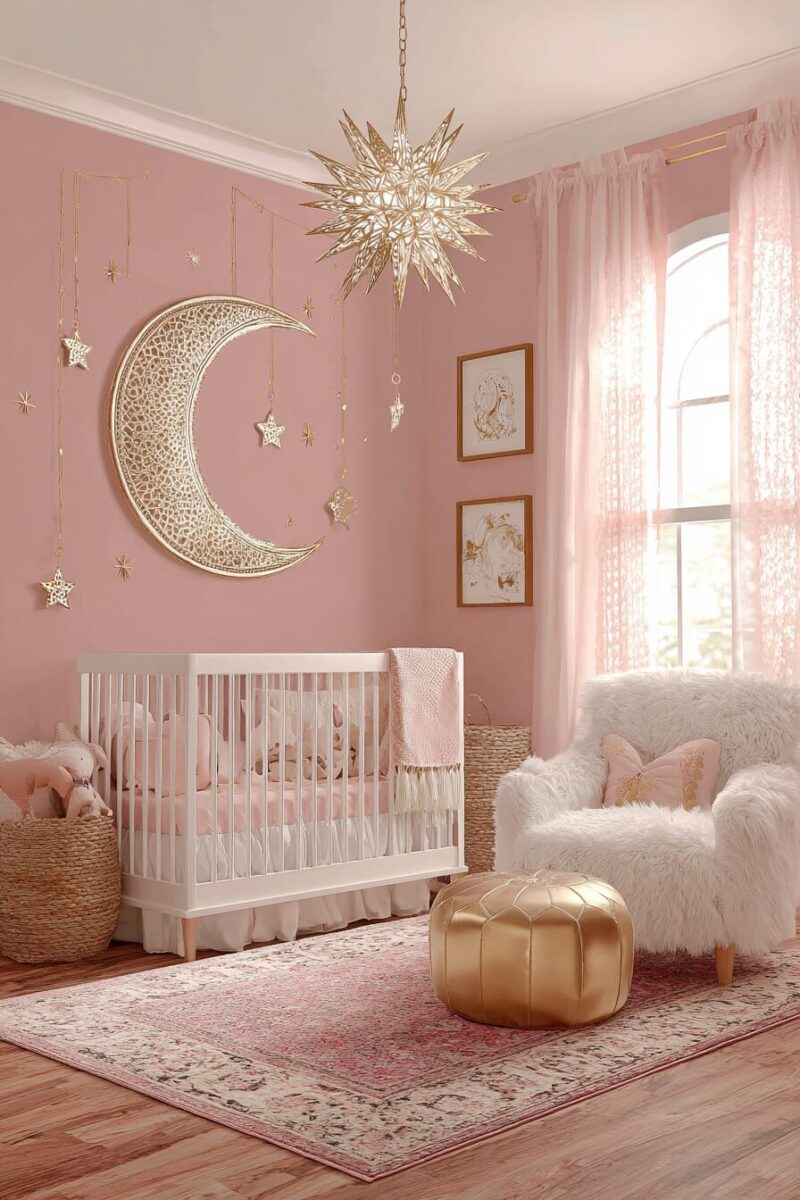 The lighting should feel magical with string lights hidden behind sheer curtains, creating a starry night effect that’s perfect for bedtime stories.