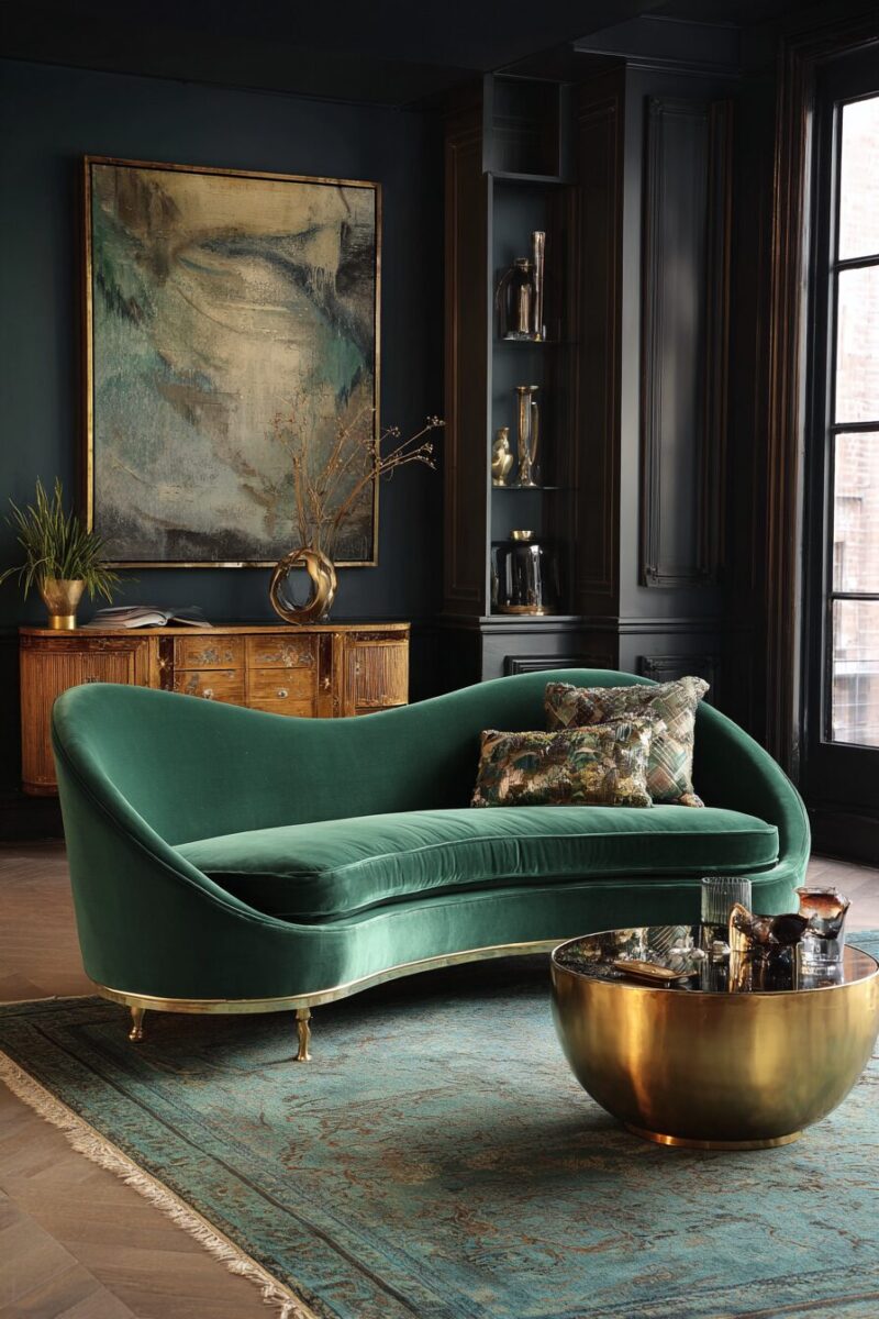 A velvet sofa in dusty rose, emerald green, or classic navy becomes the centerpiece that defines your entire room’s aesthetic.