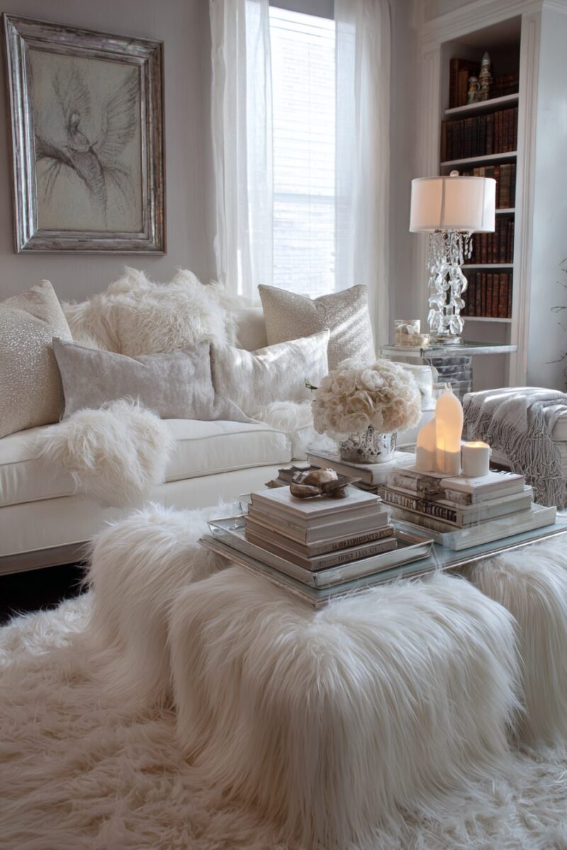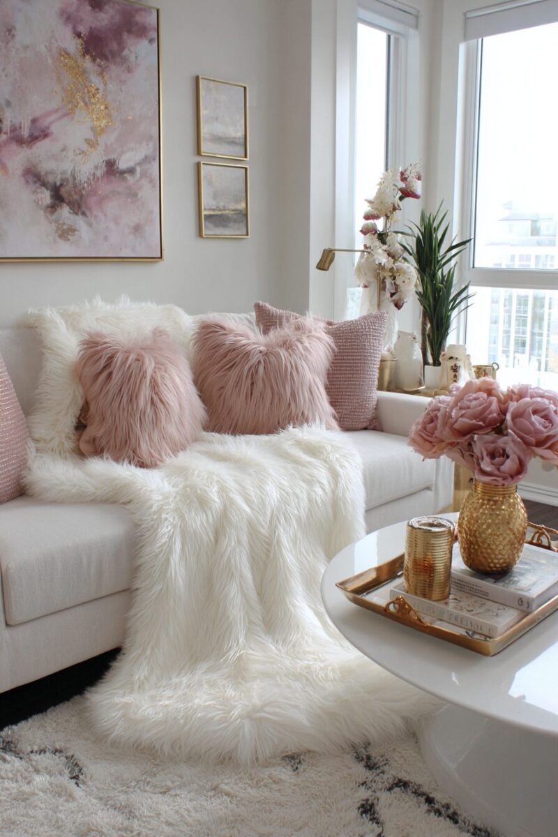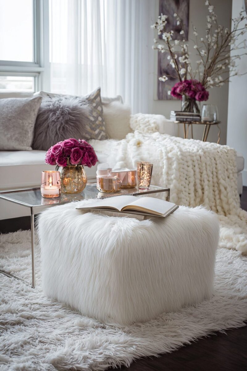 Introduce luxurious faux fur textures throughout your living room to create an irresistibly cozy and glamorous atmosphere that screams feminine sophistication.
