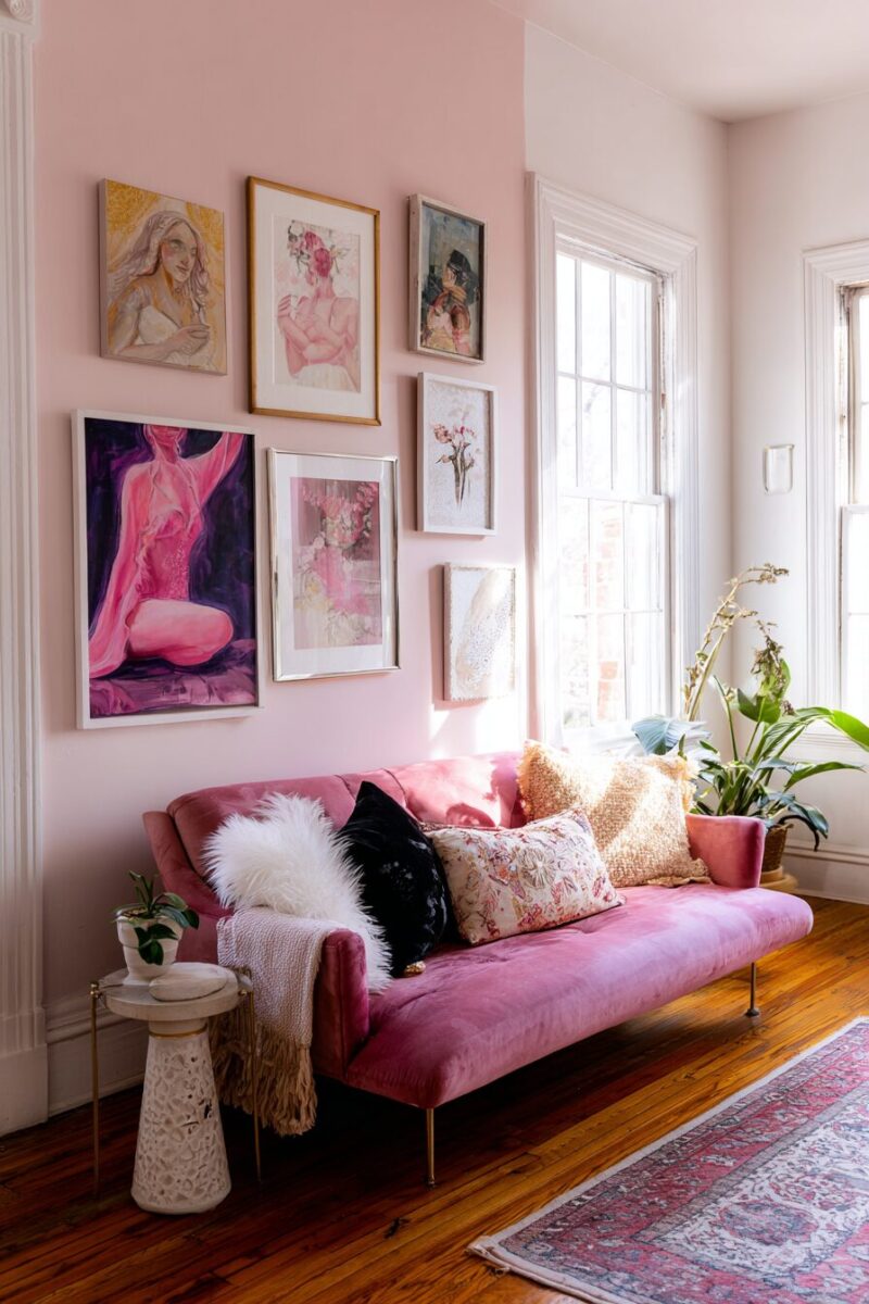 Throw pillows in varying shades of pink – from dusty rose to champagne – add depth and texture to your seating area.