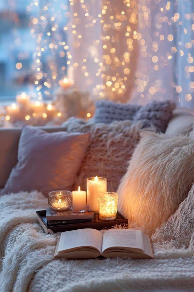 Fairy lights strung along your mantel, around windows, or behind sheer curtains add a whimsical sparkle that makes everything feel more magical.