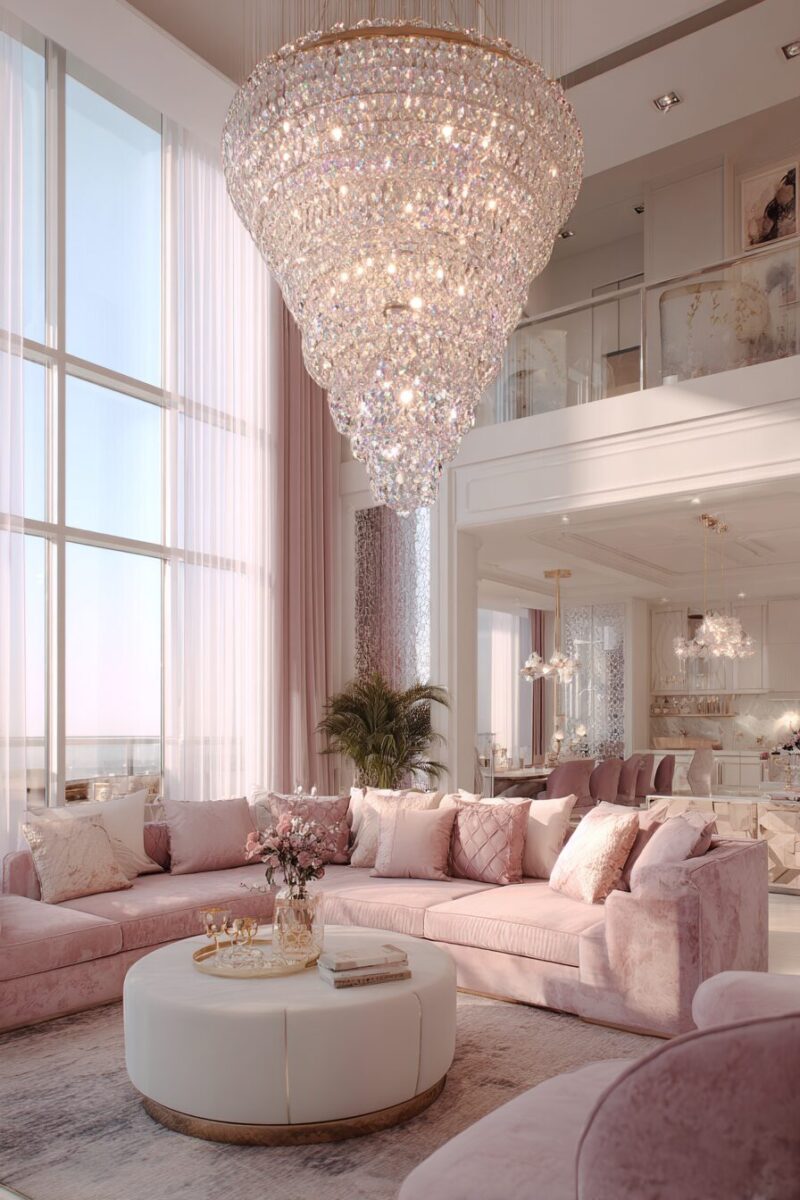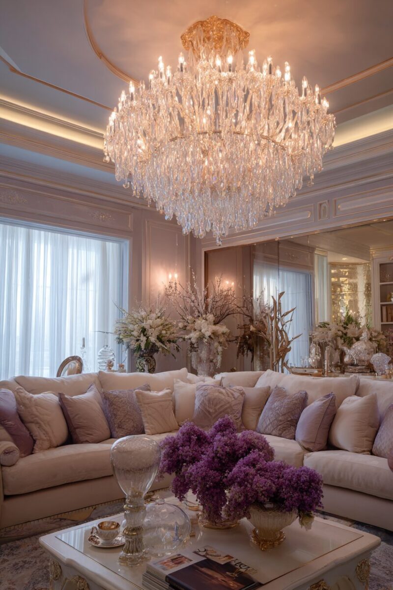 Nothing elevates a girly living room quite like a stunning crystal chandelier that casts rainbow prisms across your walls and ceiling.