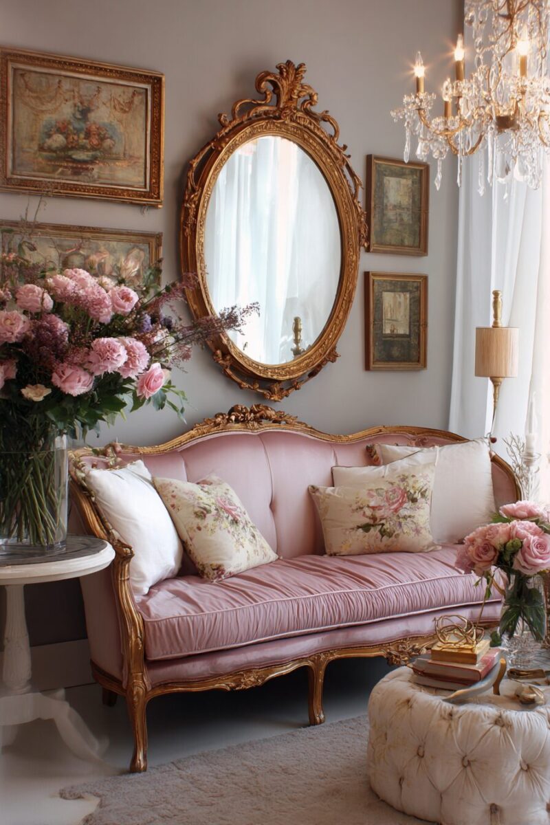Ornate gold frames, distressed silver finishes, and decorative details like carved flourishes enhance the feminine, romantic feel you’re creating.
