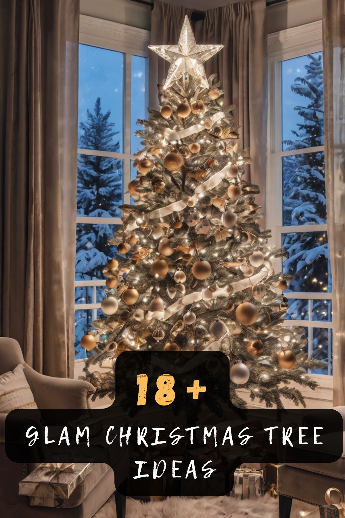 A tree dripping in gold evokes Old Hollywood luxury with metallic ornaments, glittery accents, and elegant drama.