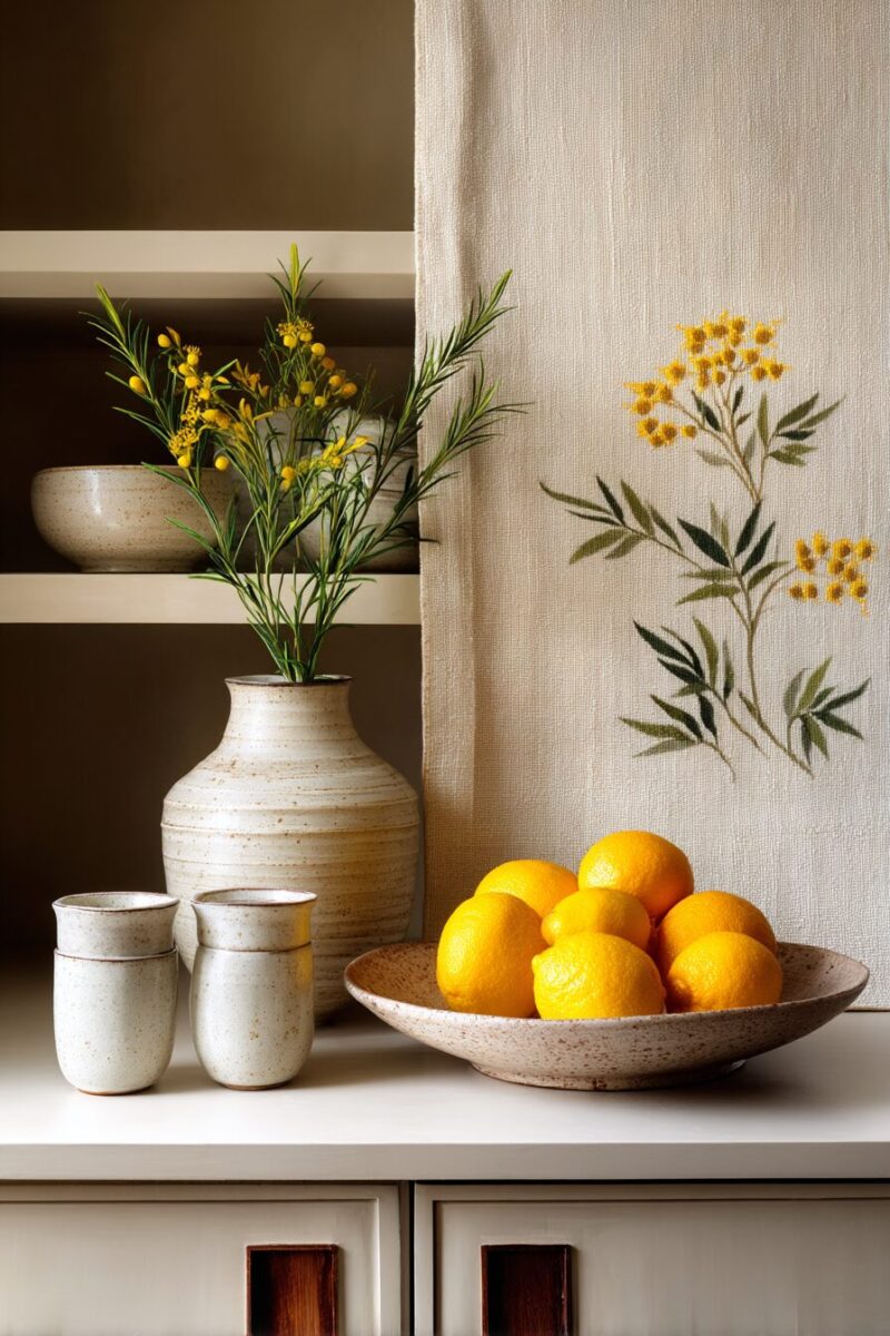 Integrate natural materials throughout your kitchen design – stone countertops, wooden cutting boards, cotton textiles, and ceramic containers all supporting the connection to the natural world.
