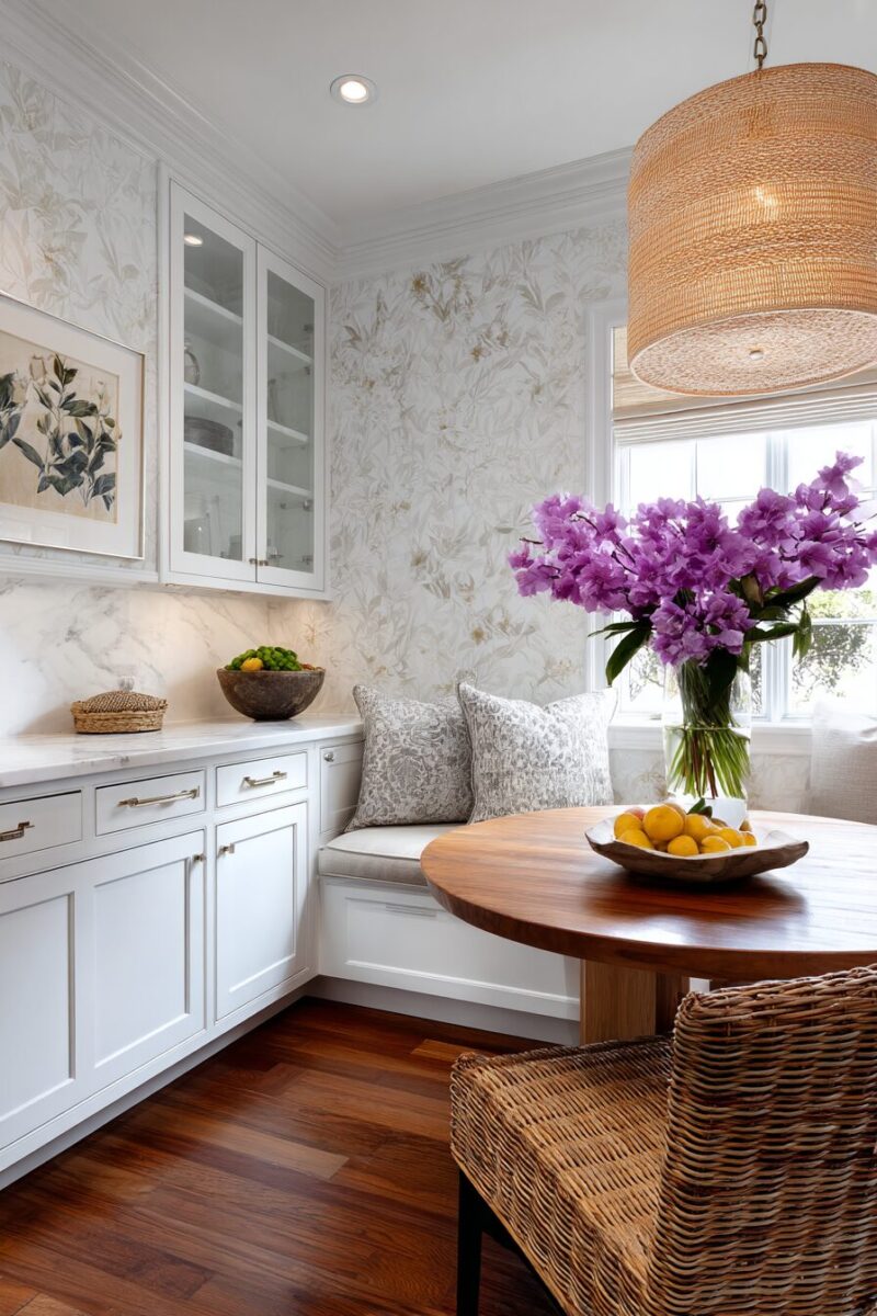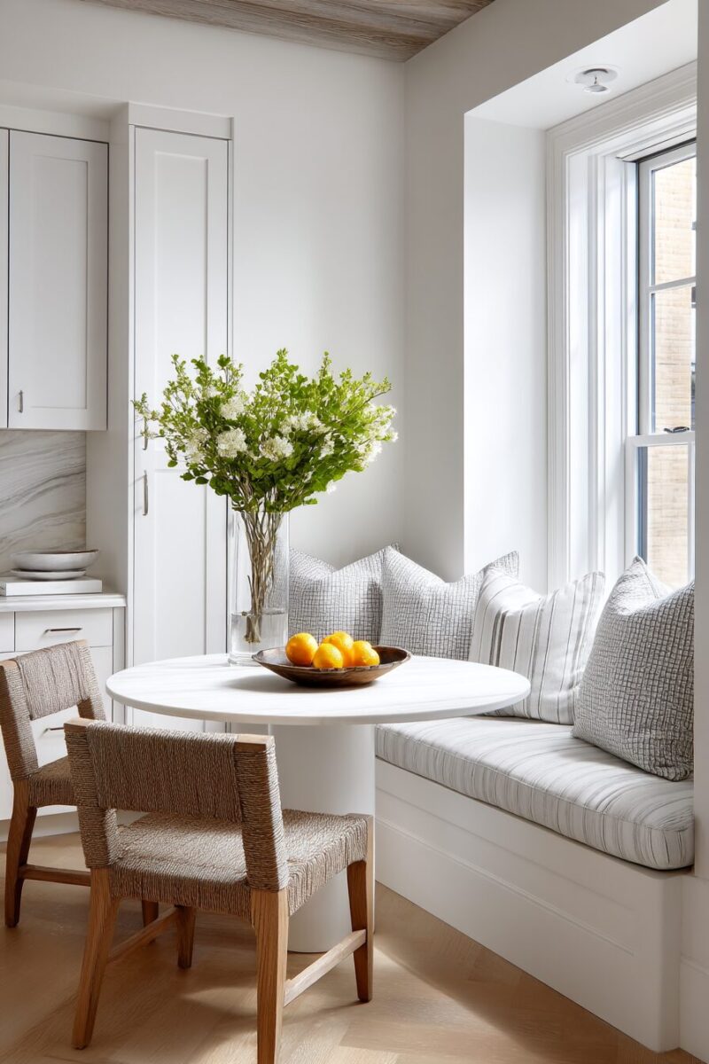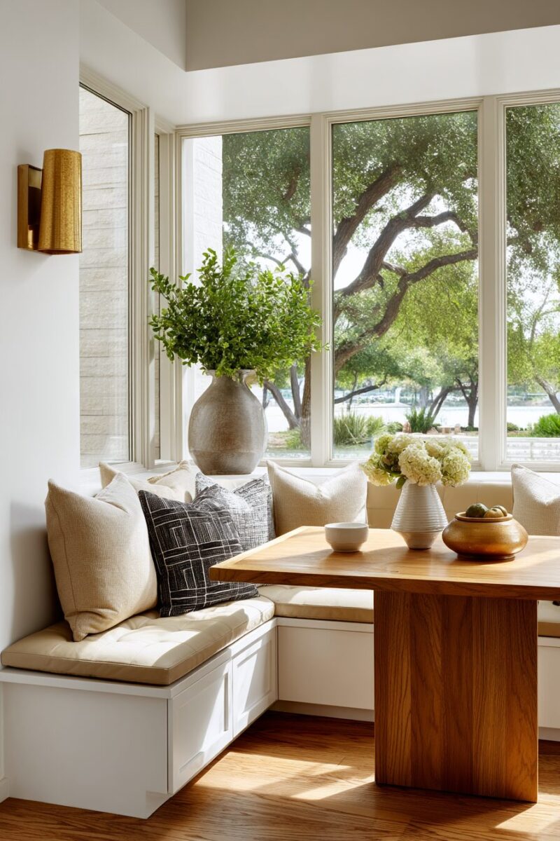 For the finishing touch, incorporate a small shelf running along the back of the bench area, creating the perfect spot for everyday items like sugar bowls, napkin holders, or small plants.