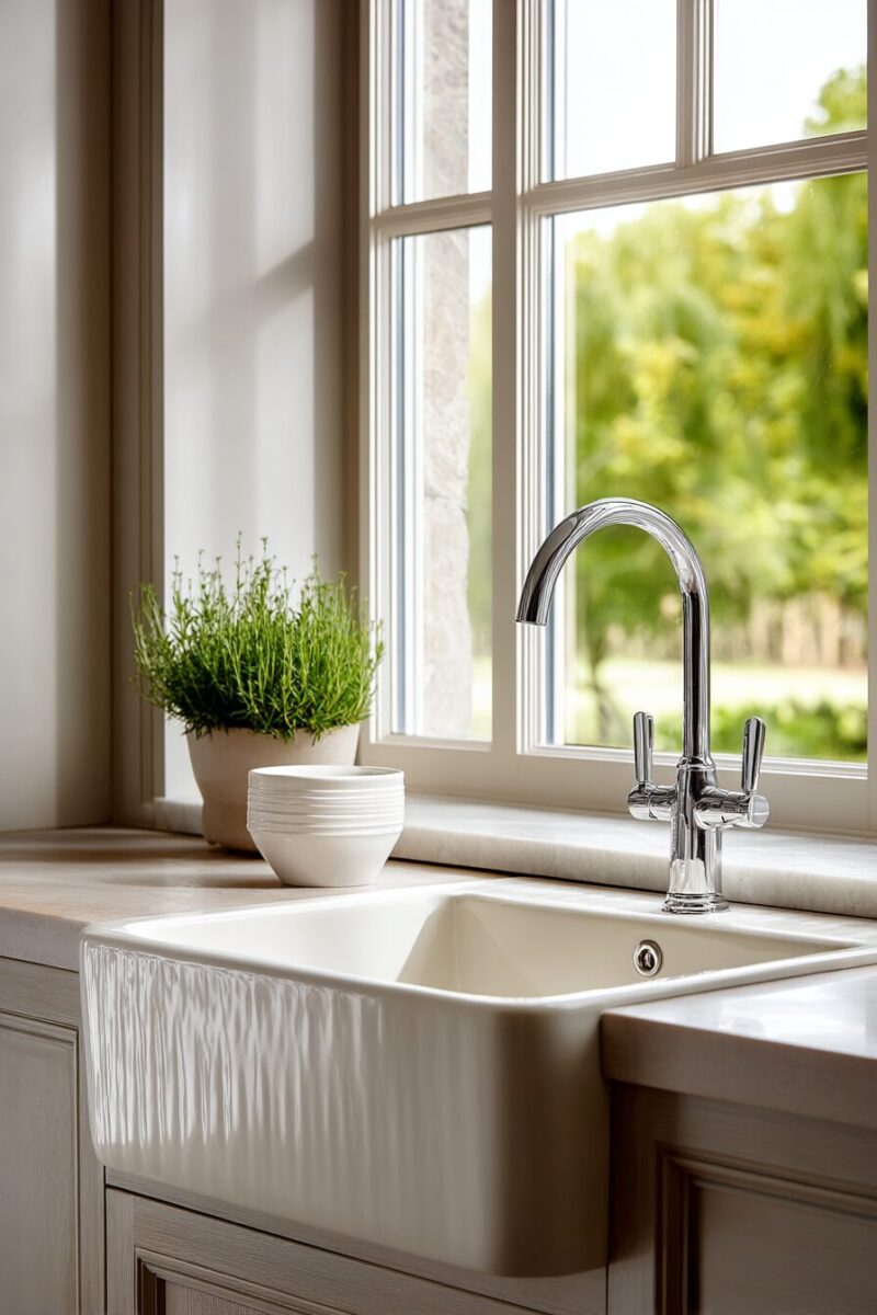 The substantial presence of a farmhouse sink naturally creates a focal point in your kitchen, so allow it adequate visual space rather than crowding surrounding areas.