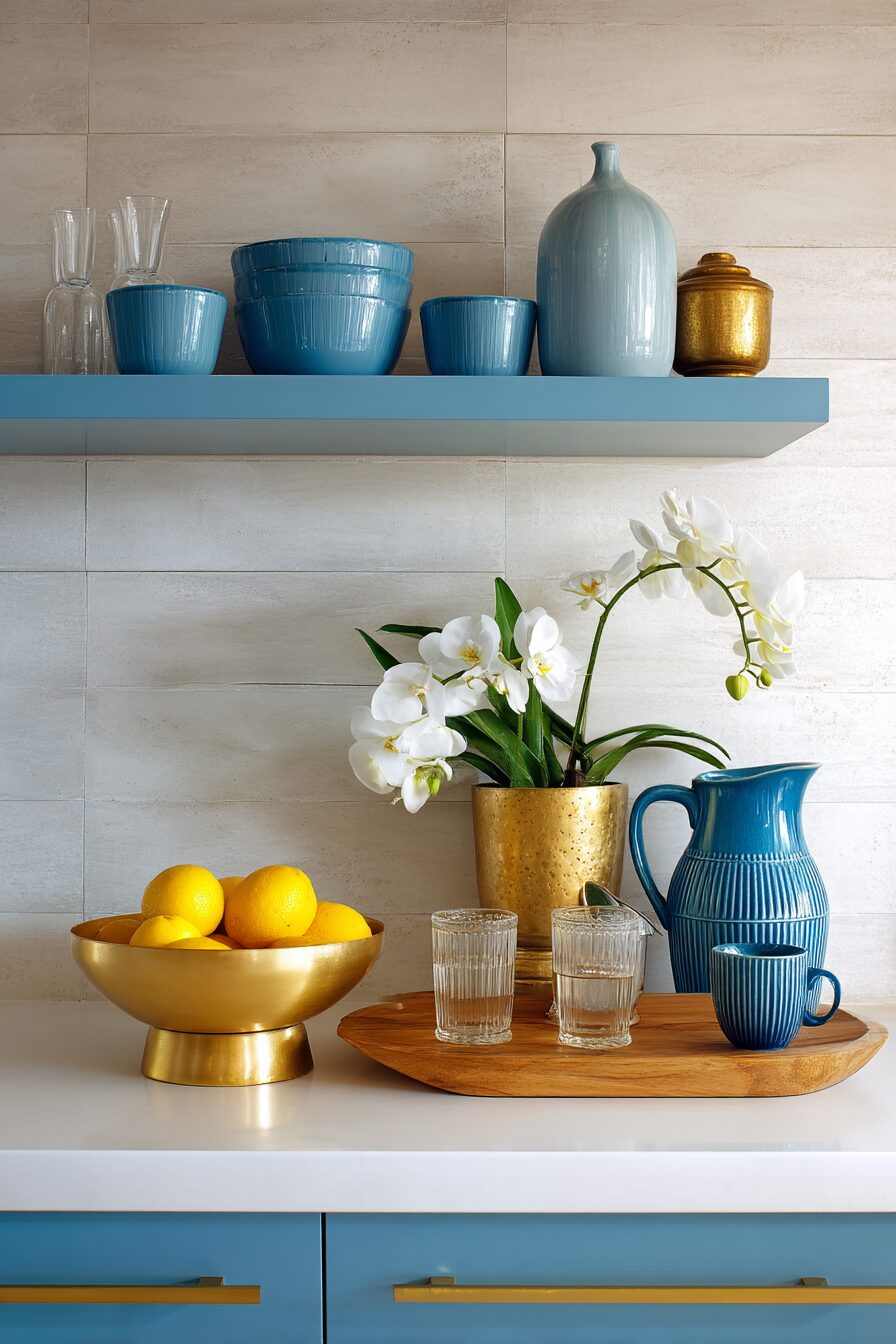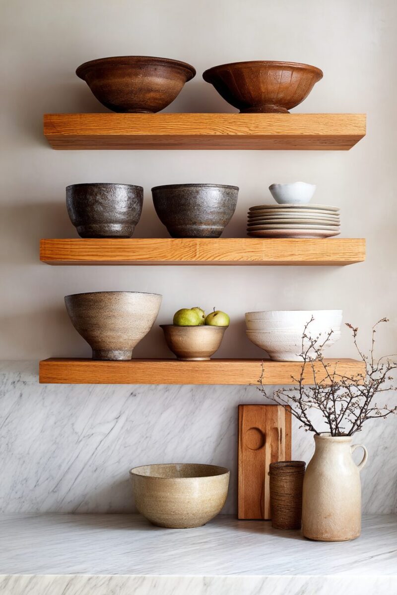 When styling your shelves, create small vignettes around themes – morning coffee station, baking essentials, or afternoon tea collection.