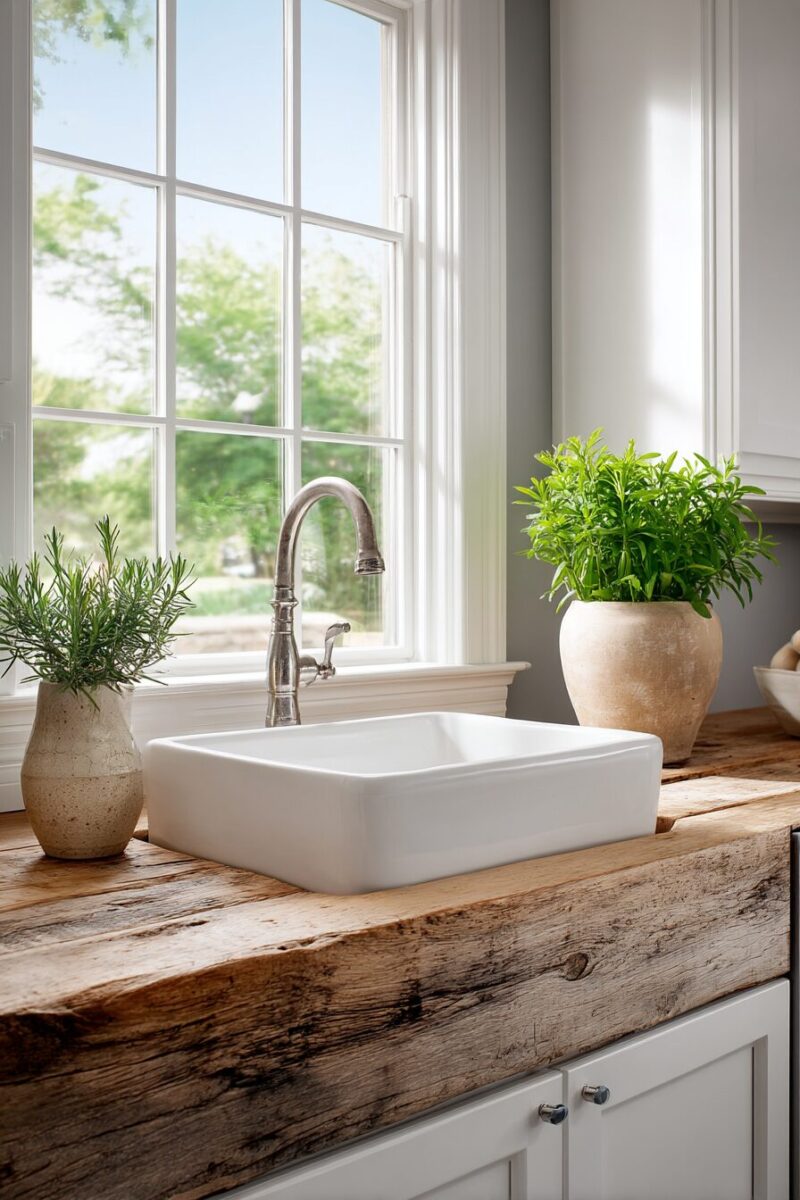 Embrace the practical beauty of sink accessories like wooden drying racks, ceramic soap dishes, or a small vase of fresh-cut flowers from the garden that can transform mundane washing into a multisensory experience.