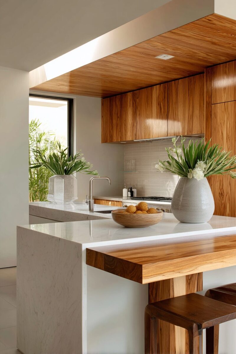 The tactile pleasure of wooden elements – the smooth edge of a well-worn counter or the substantial feel of a wooden spoon drawer pull – adds sensory richness to your daily kitchen experience.