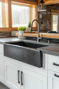 Crisp white cabinets keep the look light and bright so the dark gray tiles don’t overwhelm.