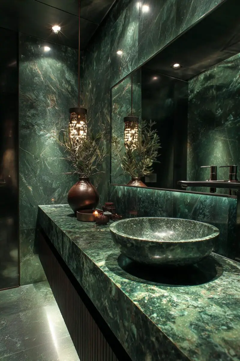 Dark green walls or large format tiles establish a bold, dramatic foundation that makes every other element in the room pop.