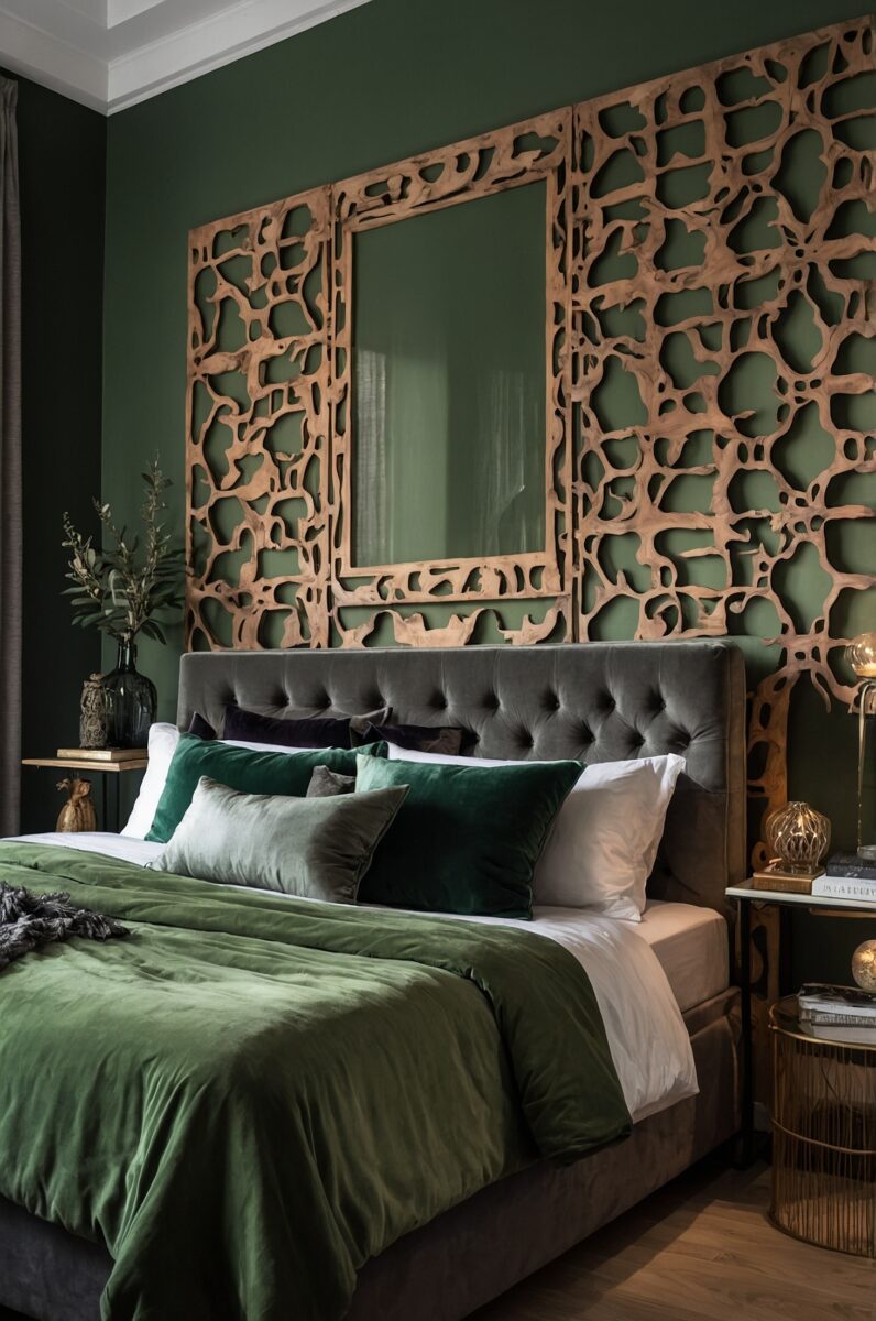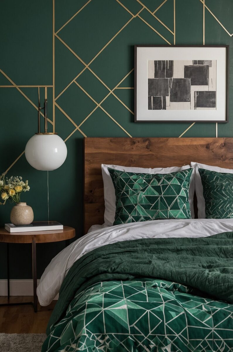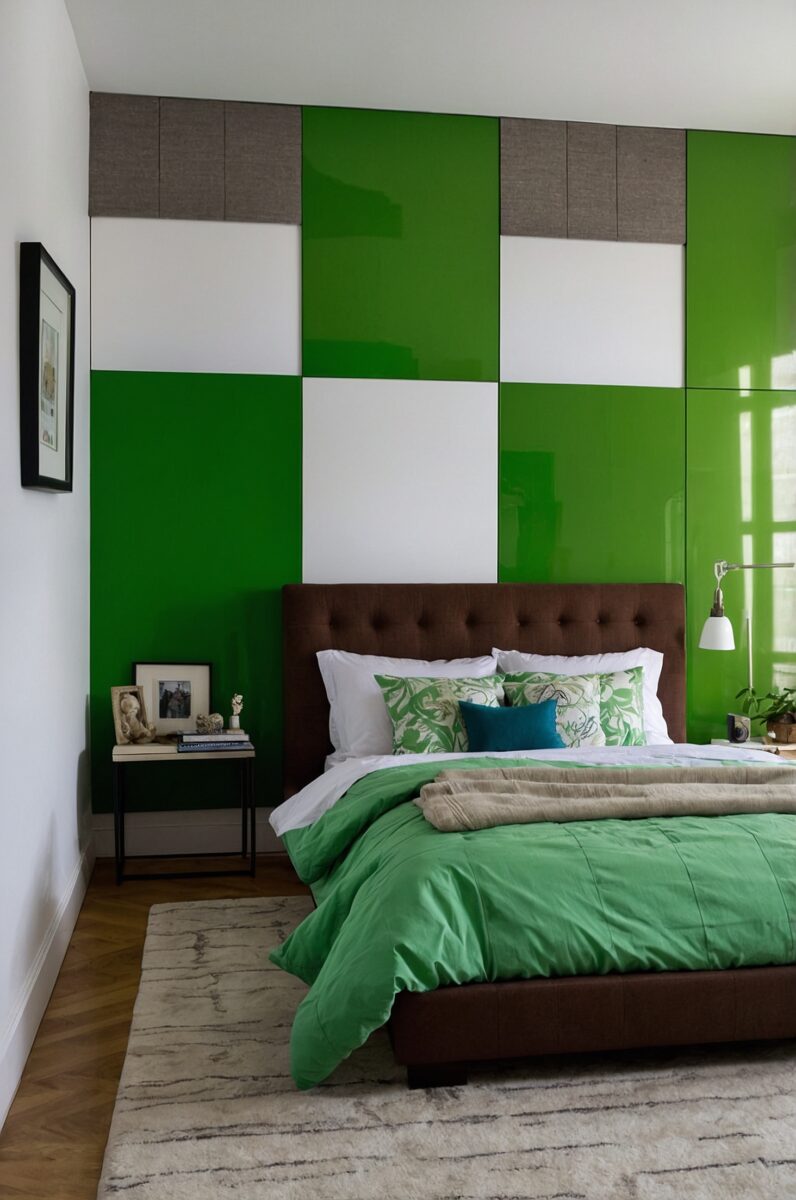 Breaking away from traditional vertical or horizontal arrangements, geometric green board patterns offer a contemporary twist that instantly modernizes any bedroom.