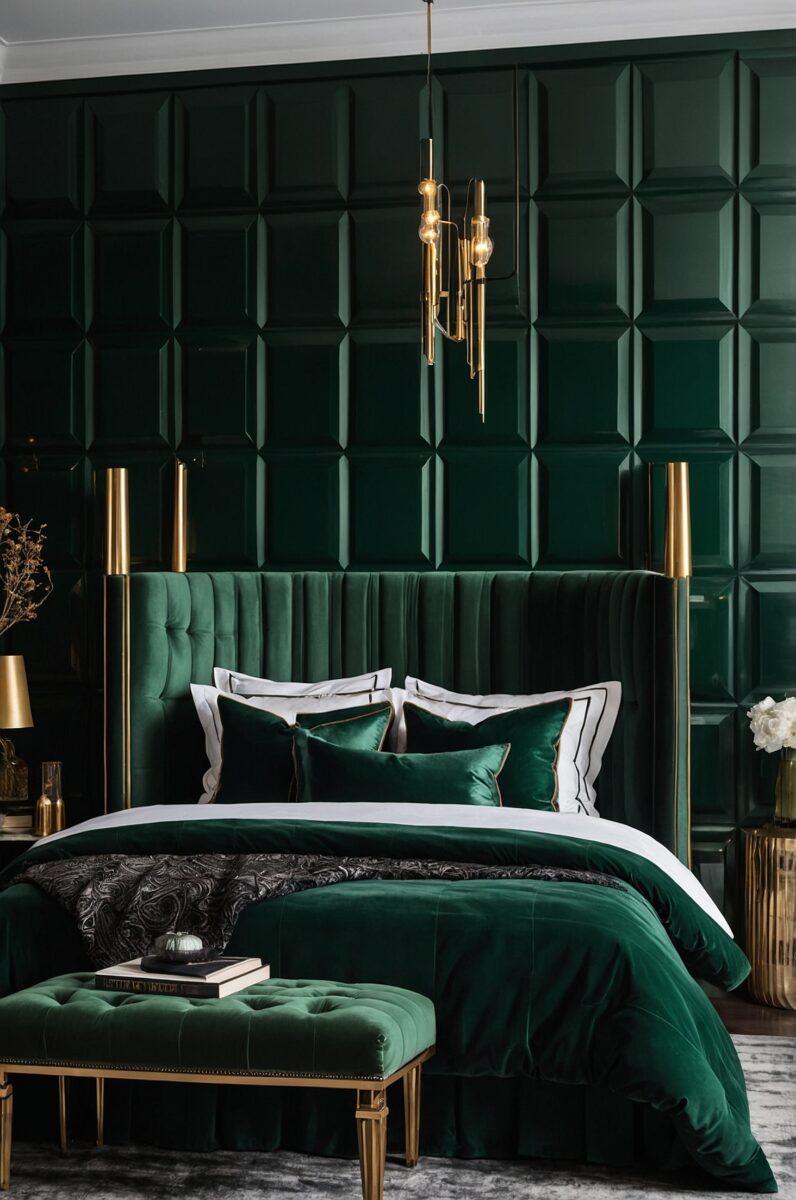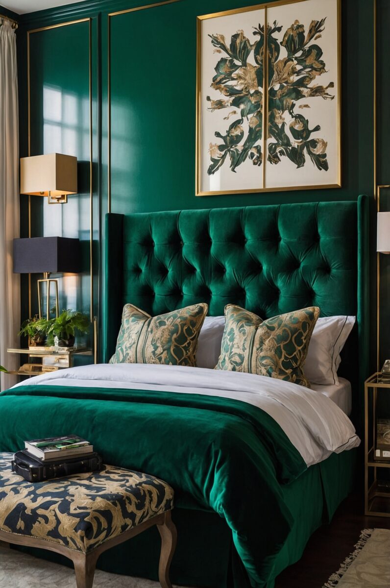 Consider adding brass or gold accents through light fixtures or picture frames to complement the emerald tone.