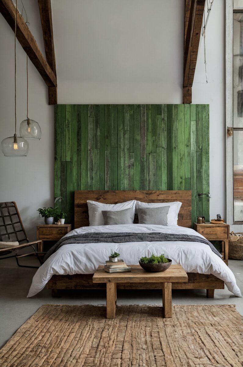 Reclaimed wood boards with weathered green paint create an immediate story in your bedroom—one of history, sustainability, and character.