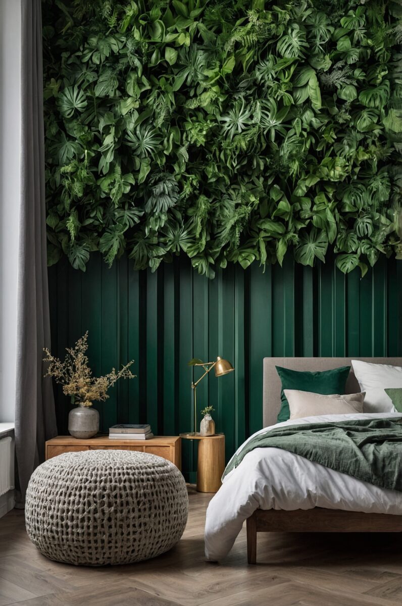 Deep forest green vertical boards create an immediate connection to the outdoors, making your bedroom feel like a sophisticated treehouse retreat.