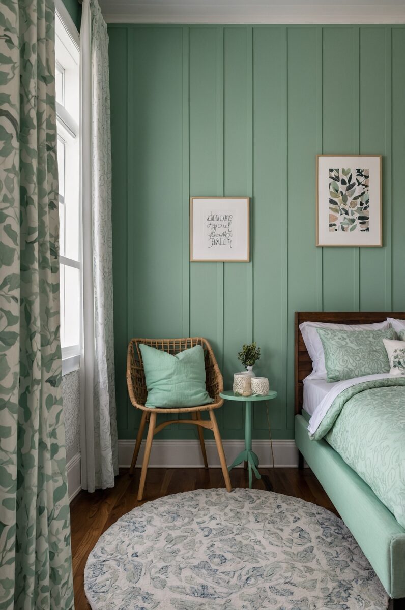 Mint green board and batten walls inject youthful energy while maintaining a classic architectural profile that prevents the color from feeling too trendy.