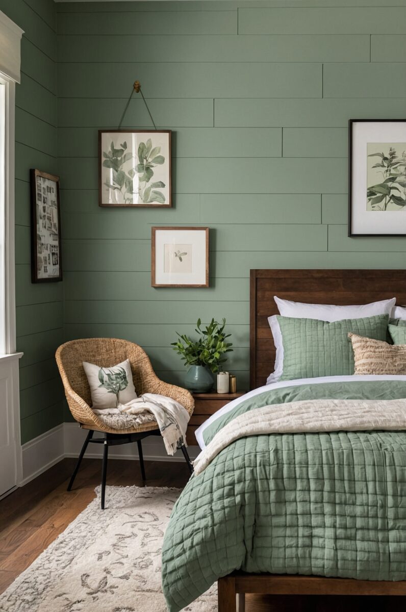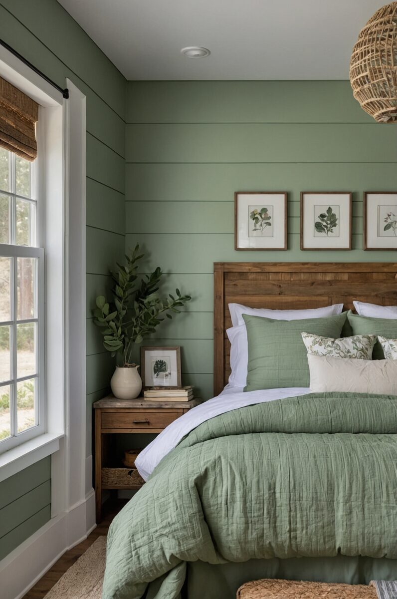Horizontal shiplap boards painted in this versatile hue create a gentle backdrop that makes your bedroom feel wider and more spacious.