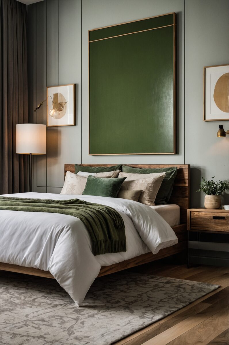 The strategic placement of these bold green elements creates visual anchors that help organize your entire bedroom design.