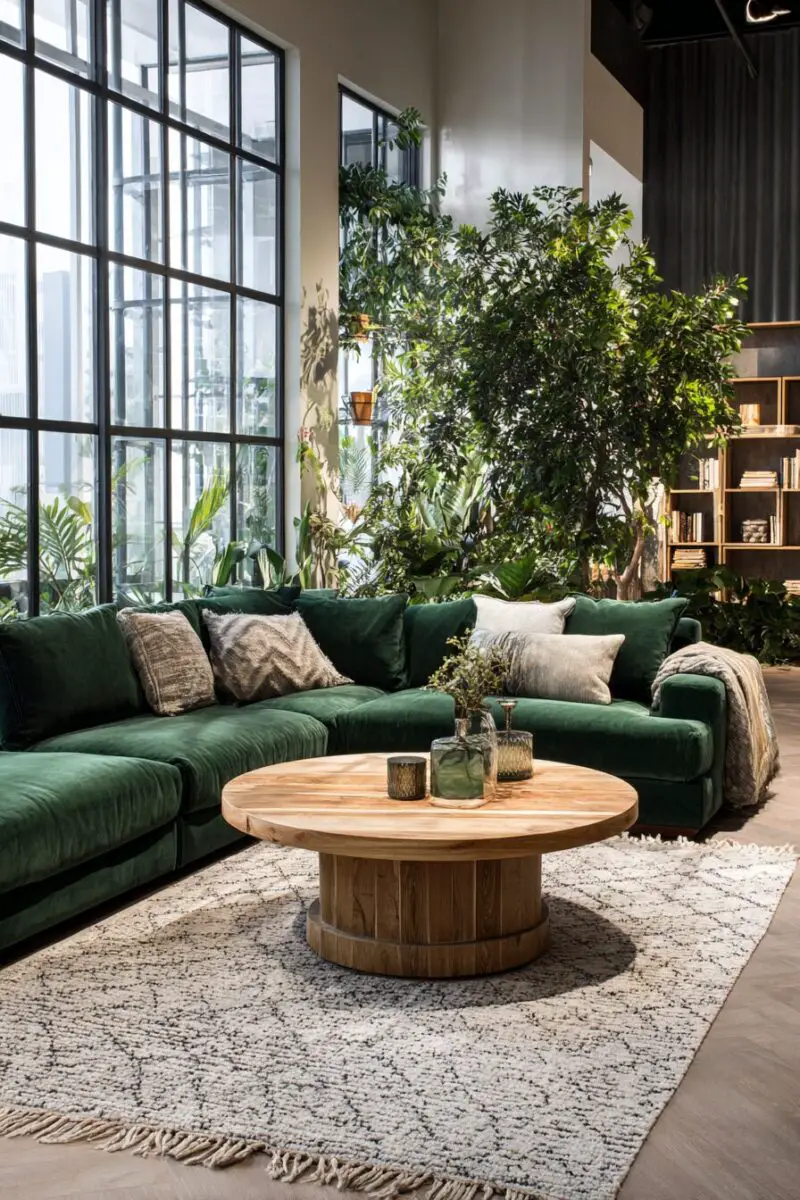 A forest green sectional paired with rich, natural wood elements creates an organic, cabin-inspired vibe that feels both cozy and surprisingly sophisticated.