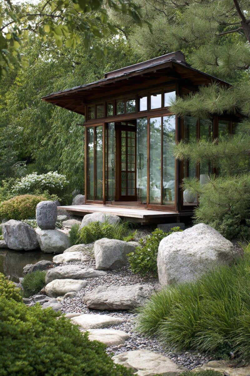 Create a peaceful sanctuary that embodies Japanese design principles of simplicity, natural materials, and harmonious proportion for the ultimate garden retreat.
