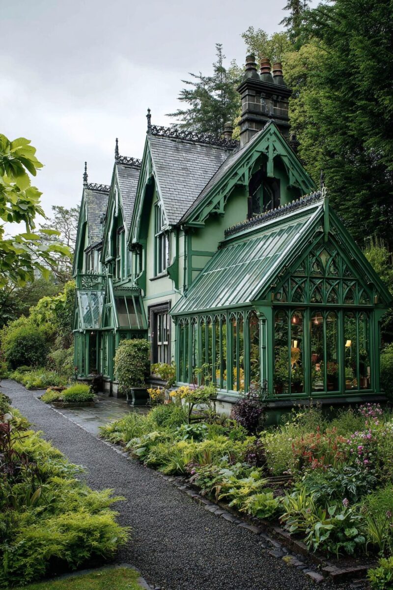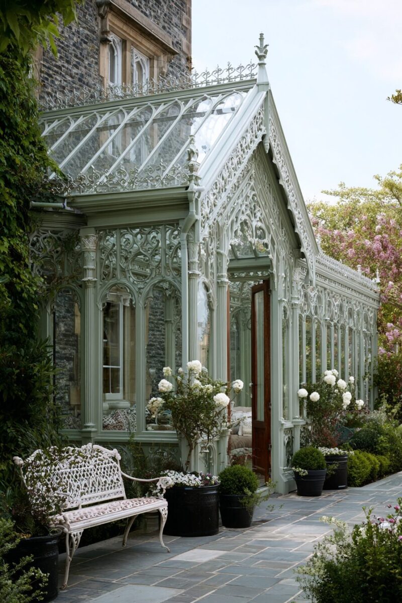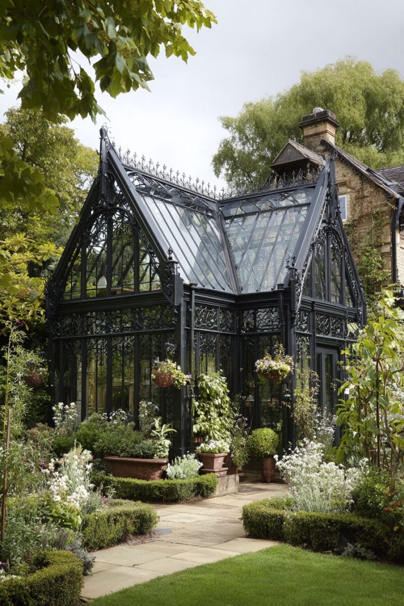 Step back in time with an elegant Victorian-inspired greenhouse that features intricate metalwork and classic architectural details reminiscent of grand estate conservatories.