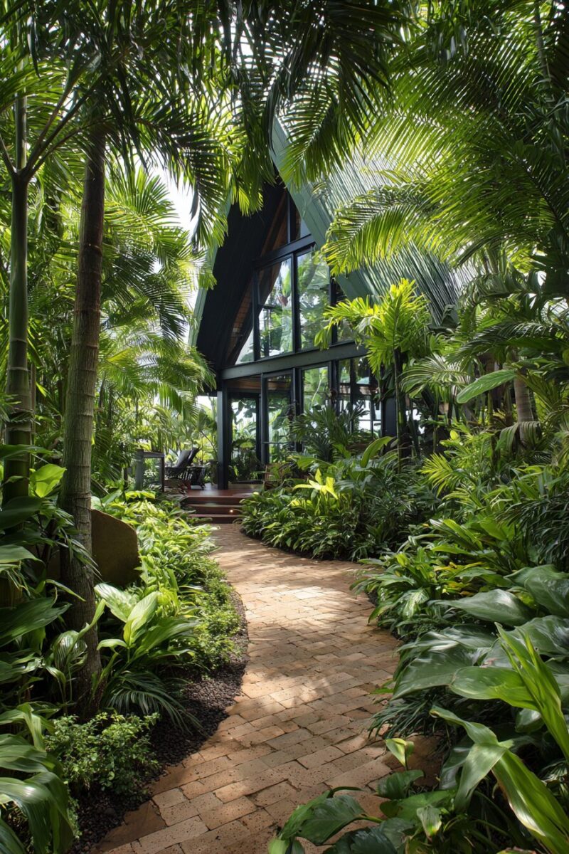 The interior plantings visible through the glass should reinforce the tropical theme with orchids, bromeliads, and other exotic plants that thrive in the protected environment.