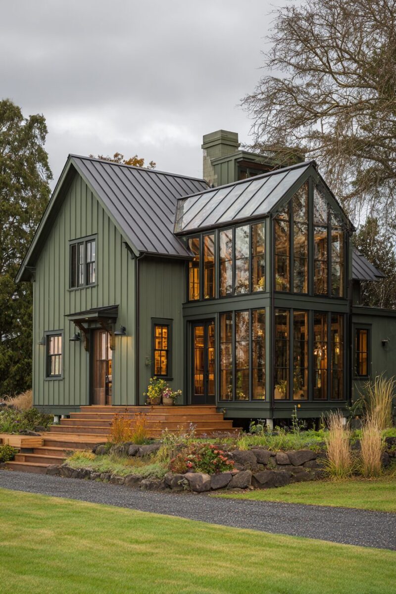 Interior furnishings visible through the glass become part of the exterior aesthetic – terracotta pots, wooden benches, and rustic tools all contribute to the authentic feel.
