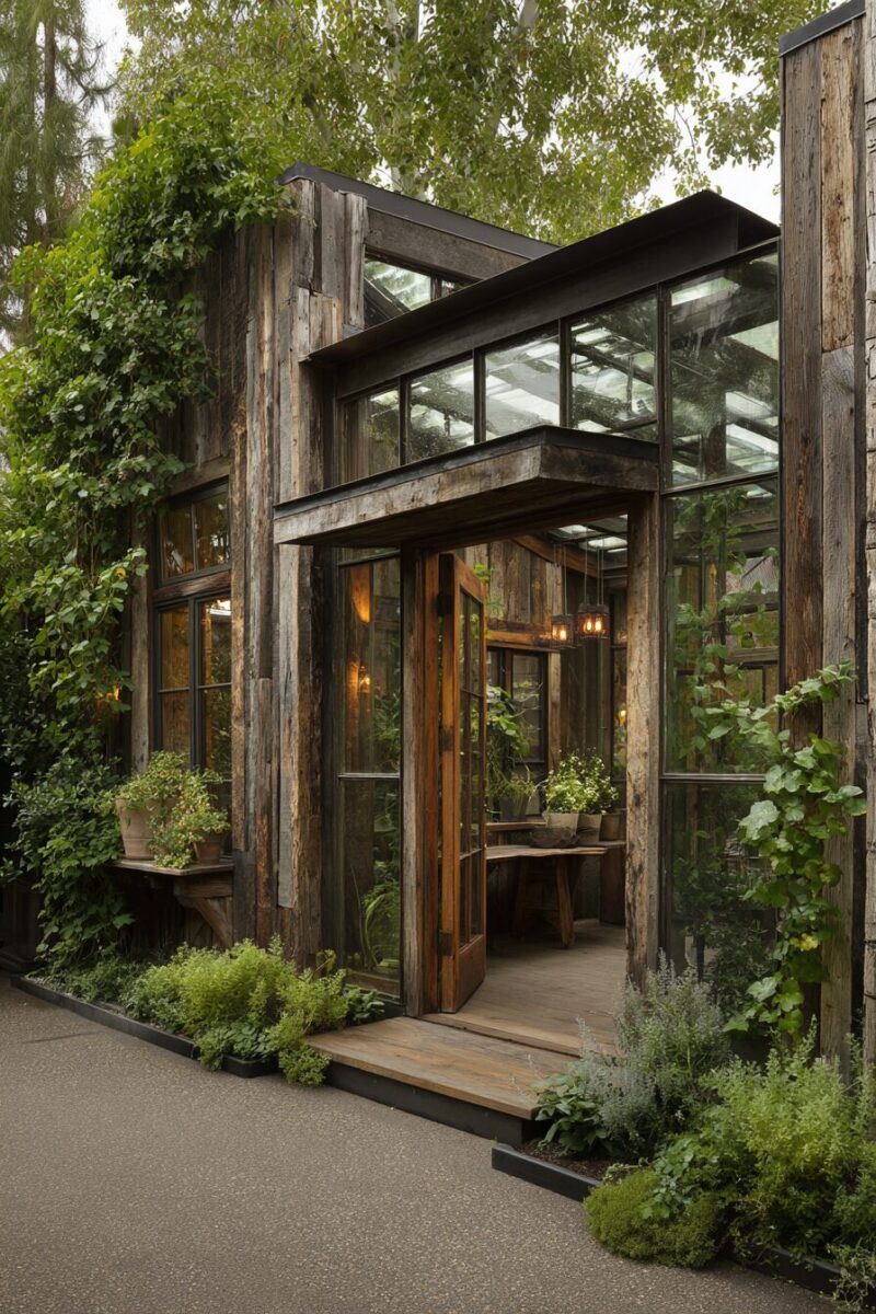 Nothing says “cozy garden retreat” quite like the warm, weathered look of reclaimed barn wood wrapping around your greenhouse frame.
