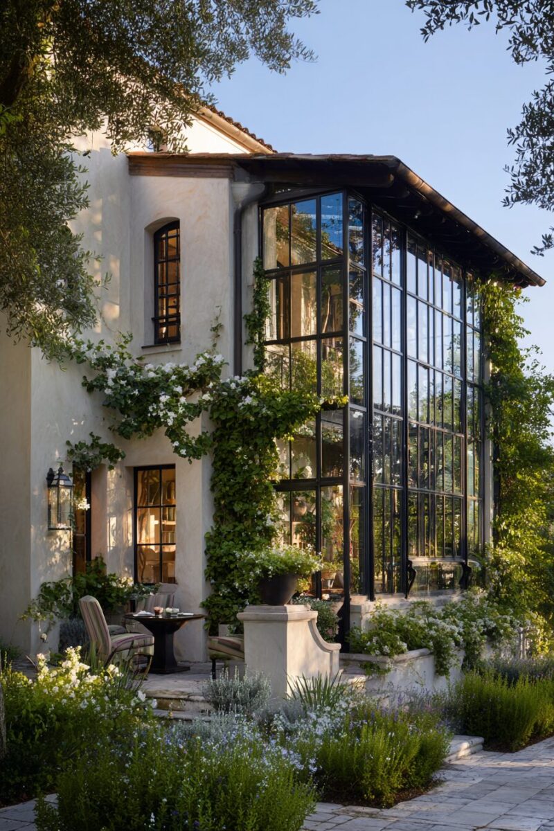 Climbing vines like grape, jasmine, or bougainvillea can be trained along the exterior walls to soften the structure and add to the Mediterranean garden atmosphere.