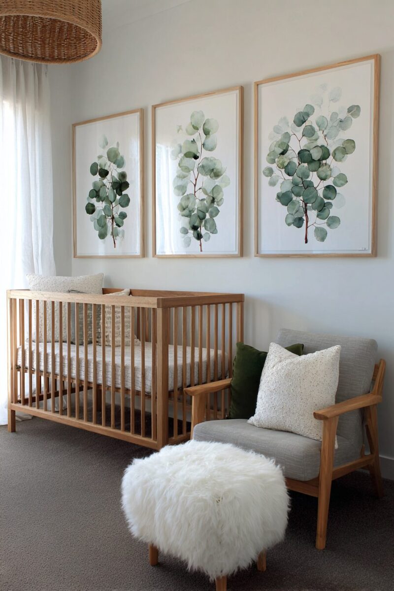 You can extend the botanical theme beyond wall art by incorporating real eucalyptus in your nursery design – dried eucalyptus garlands or small potted eucalyptus plants add authentic texture and subtle fragrance.