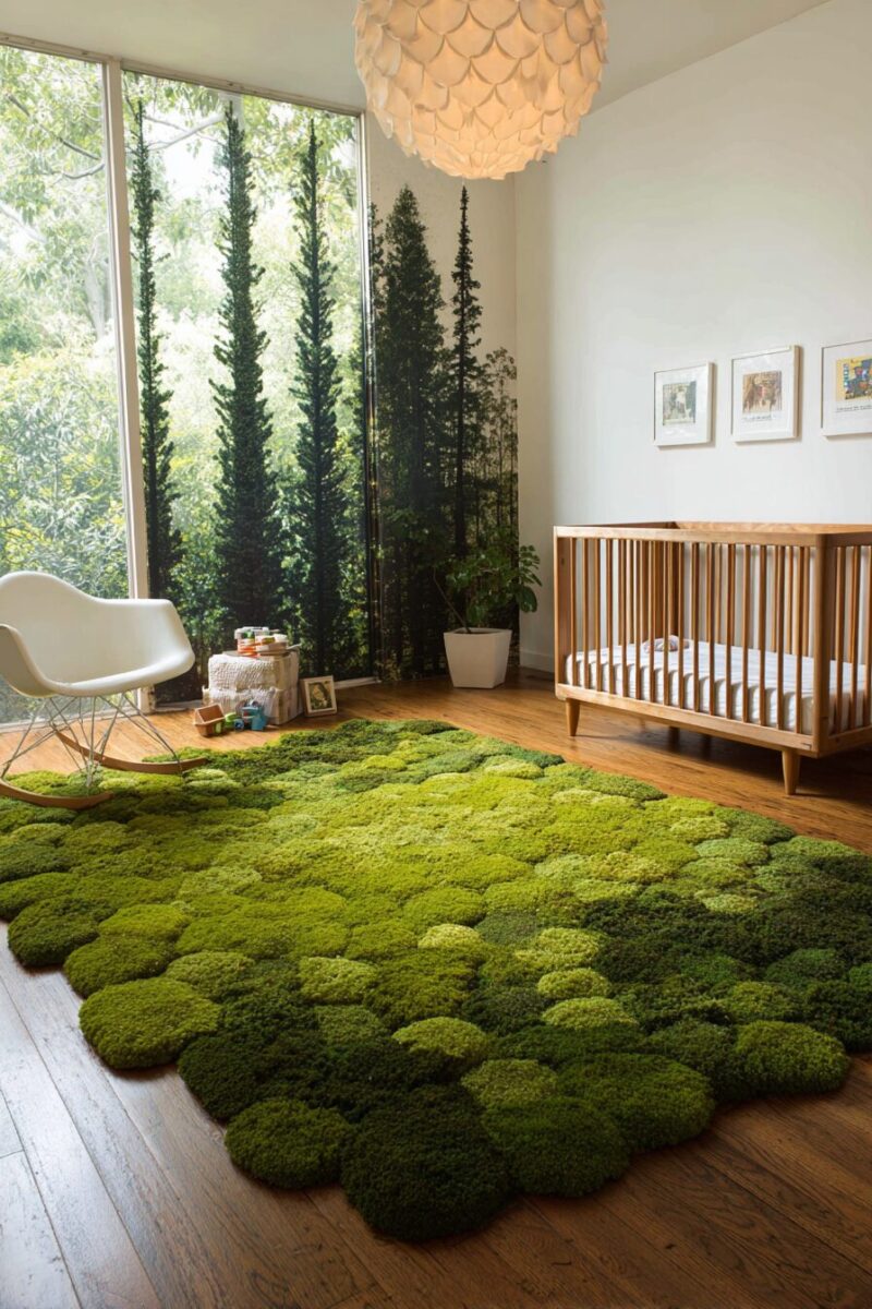 Textured rugs that mimic the soft, springy feel of forest floors create an incredibly tactile and visually striking foundation for your green nursery while providing practical benefits for playtime and comfort.