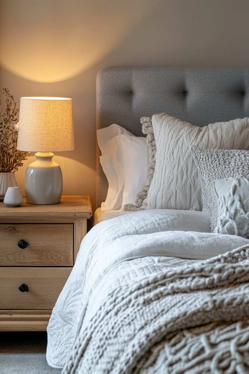 Start with a stylish bedside lamp—something with a ceramic or glass base adds a touch of elegance.