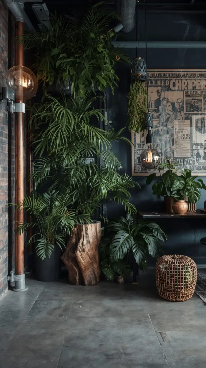 Adding some greenery like vines can introduce a natural element that complements the edgy decor.