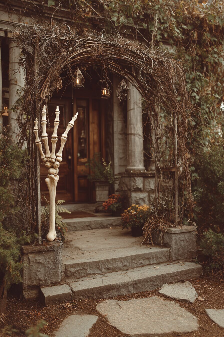 This entrance design works particularly well when combined with backlighting that casts dramatic shadows of the skeletal hands onto your house, creating an even more imposing and theatrical effect.