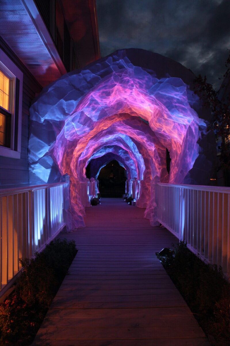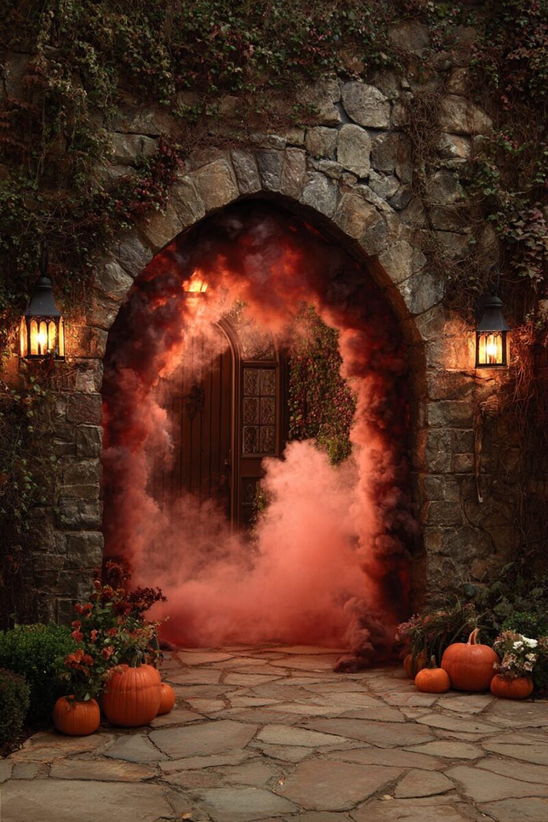 This entrance works particularly well when combined with projection mapping that displays swirling magical symbols on nearby walls or the ground, creating the impression of active spellcasting happening all around your doorway.