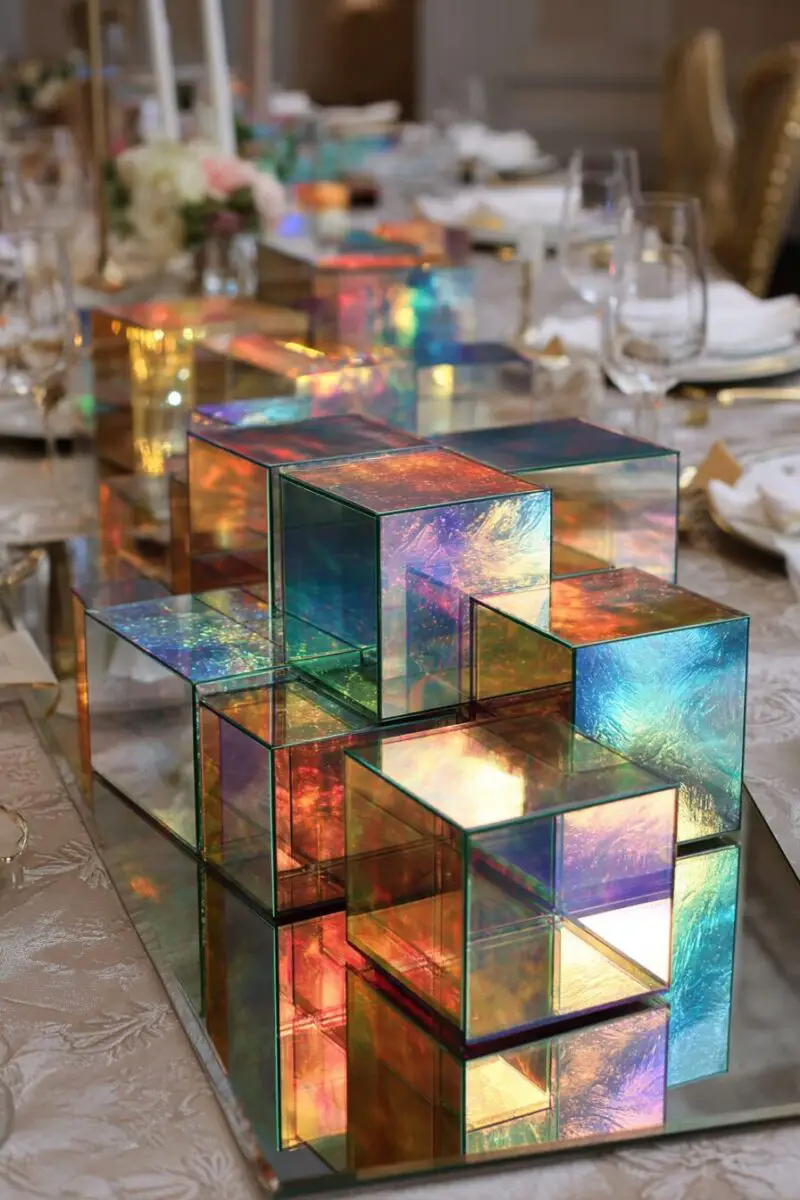 Add small prisms around the mirror arrangement to break white light into rainbow spectrums that shift as guests move around the table.