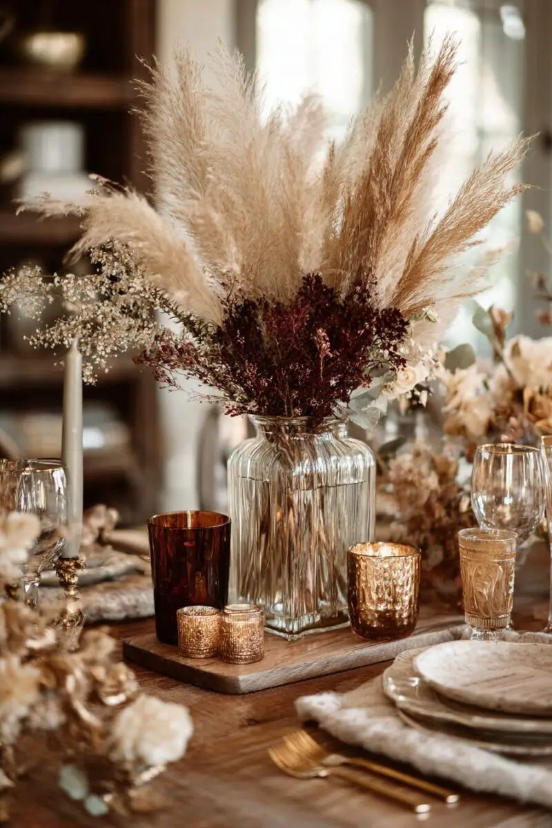 Dried pampas grass mixed with dark flowers creates a moody, bohemian Halloween tablescape that feels fresh and contemporary.