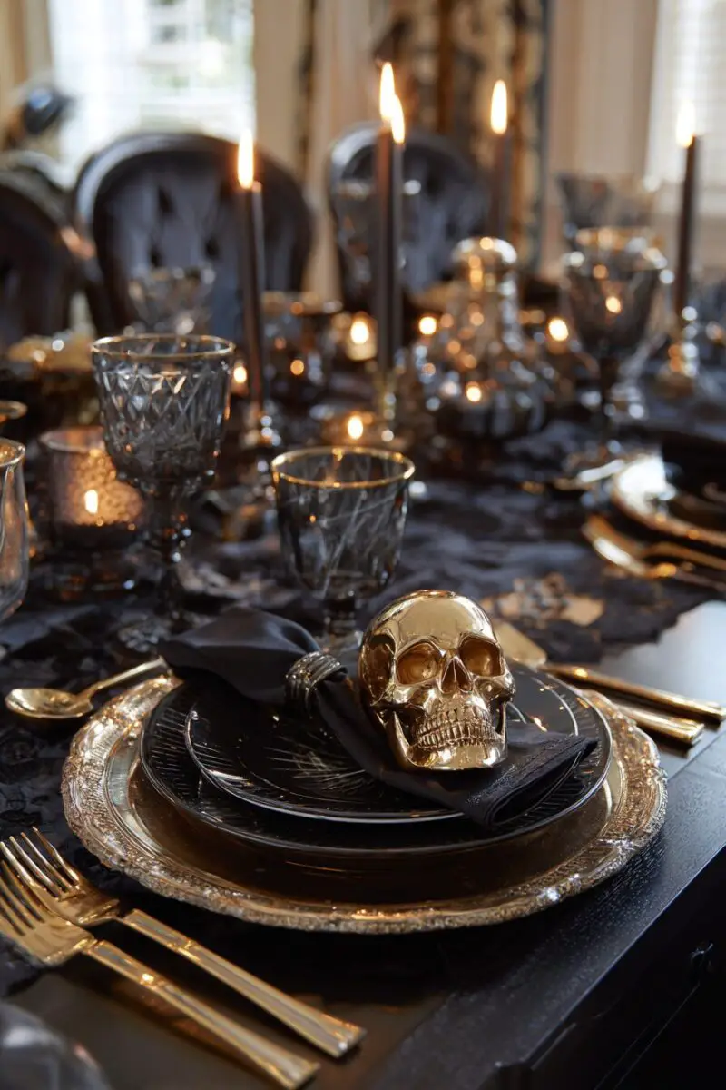 Black and gold create the perfect foundation for a sophisticated Halloween tablescape that screams luxury with a haunting twist.