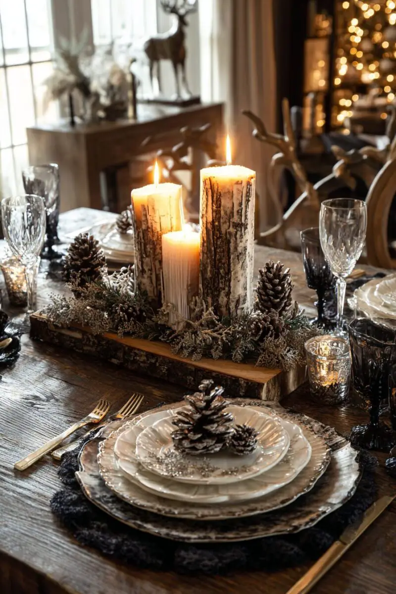 Use tree slice chargers or rough-hewn wooden plates to reinforce the forest theme.